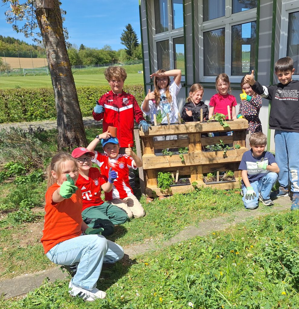 Auf der Grünfläche vor dem Fenster der Schulküche entstand ein neues Pflanzbeet. Mithilfe des Hausmeisters wurde die Palette vorbereitet und aufgestellt. Anschließend bepflanzten die Mädchen und Jungen der Umwelt-AG das Palettenbeet mit verschiedenen Kräutern und Erdbeersetzlingen.
