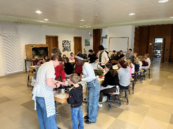 Nach der Backaktion fand in der Aula eine kleine gemeinsame Feier statt. Bei Weihnachtsmusik wurden die frisch gebackenen Plätzchen und der warme Punsch gemeinsam verzehrt. Die Kinder erzählten sich Geschichten, sangen Lieder und freuten sich über das gelungene Miteinander.